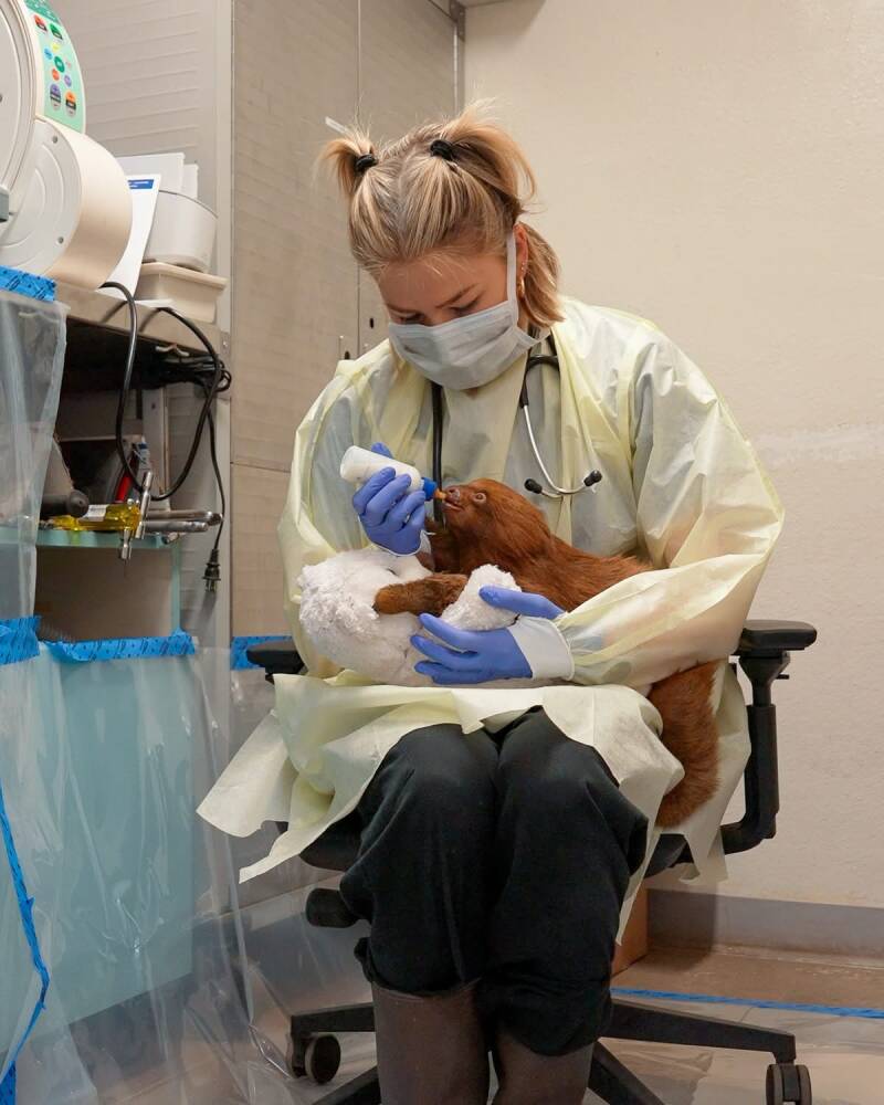 Images of Animal Care Specialist Dr. Hailey Straub working with the sloths: