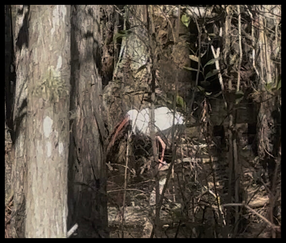 On the walk back from the tower, 2 Carolina Chickadees were seen hopping on branches, pecking, & hanging upside down. 2 Turkey Vultures flew over at the same time. The White Ibis were seen again 30–40 ft from where they were before. There were 3 of them, so the solo Ibis must have joined the others. The water appeared to be higher than in days prior either due to precipitation the days before or the ice or even both.